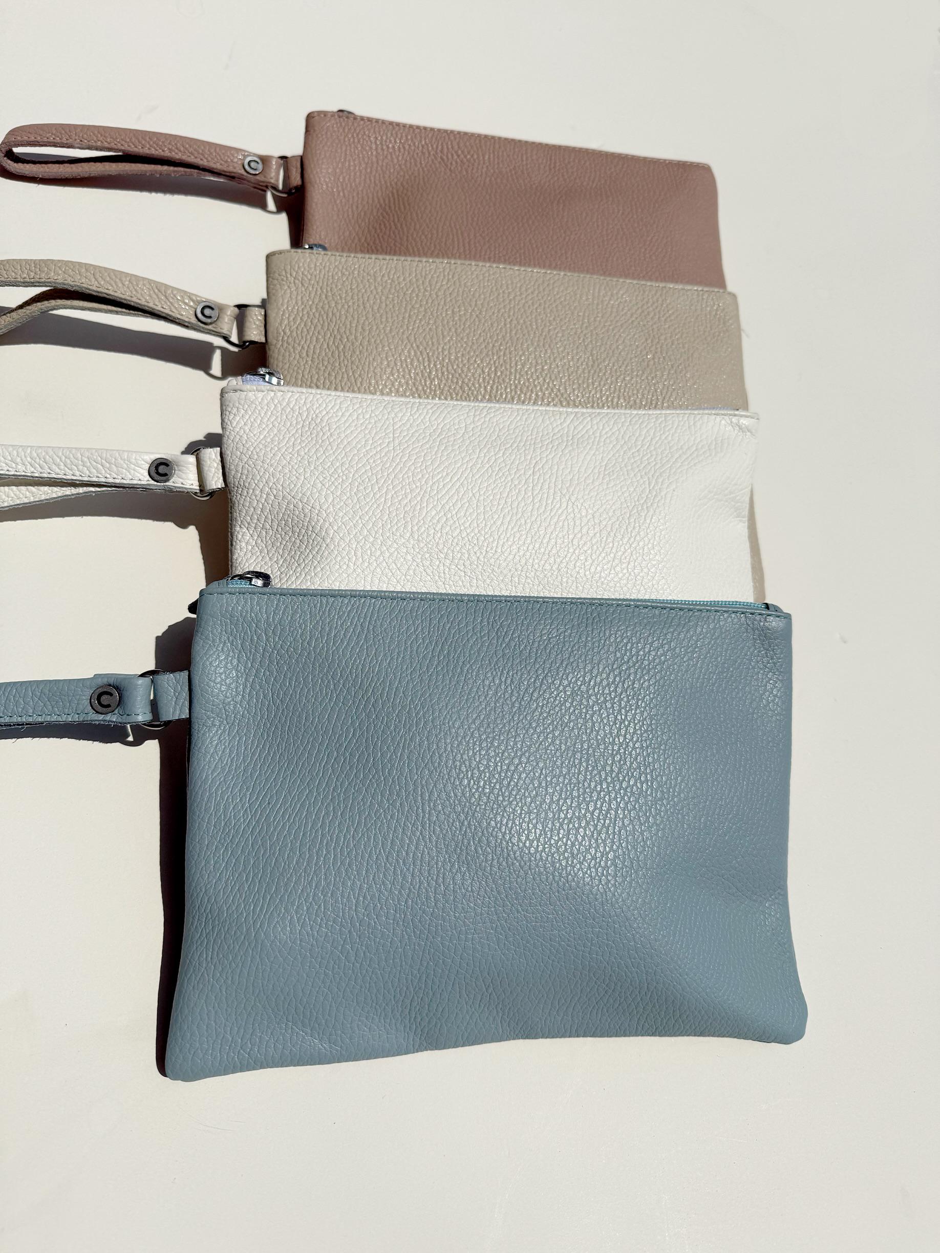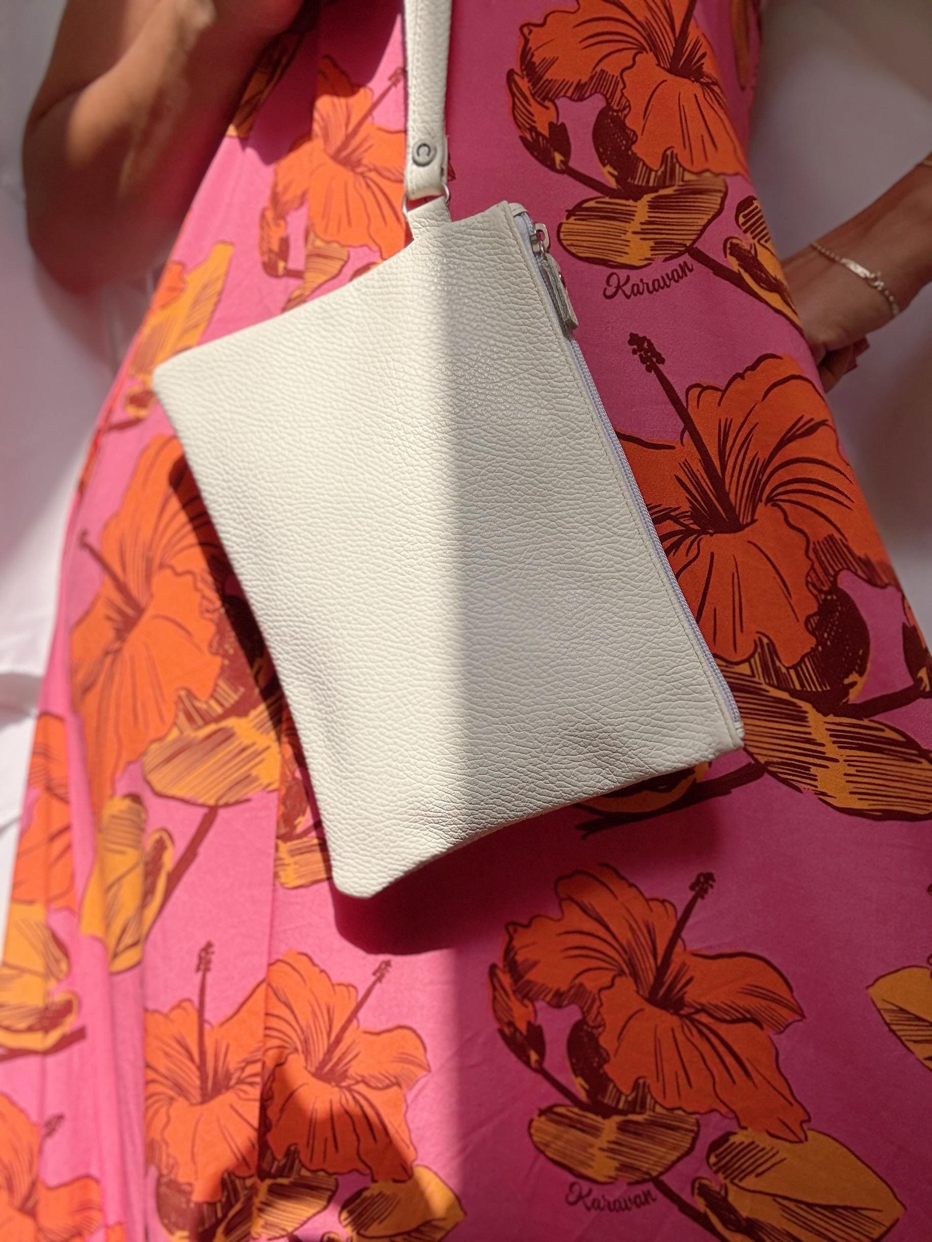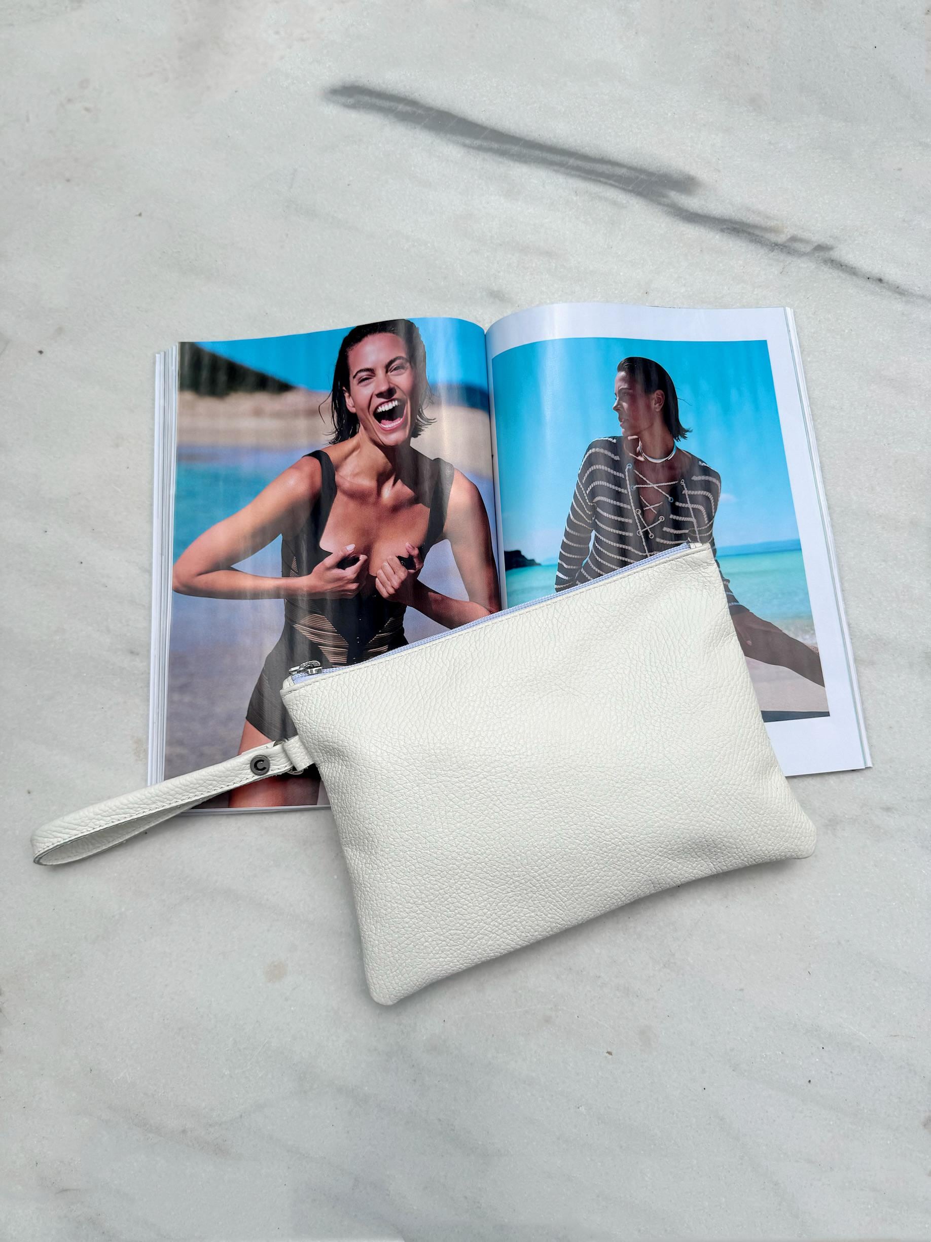 My new white clutch would be your everyday summer essential. Its handmade from full grain cow leather. Featuring a wrist strap, a secure zipper, and soft texture, it’s perfect for holding your phone, keys, or makeup. A minimal leather purse you’ll carry from beach days to nights out! Find them only at our Store.